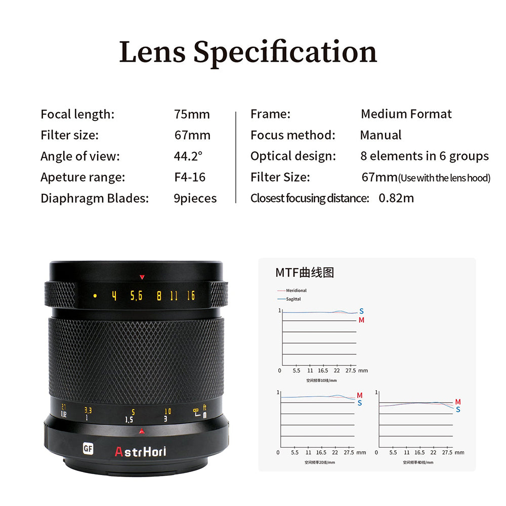 - Excellent Optical Structure: The lens structure is 11 elements in 8 groups, which can satisfy the 100 million pixel body, and can cover 33*44 sensors, with excellent center image quality.